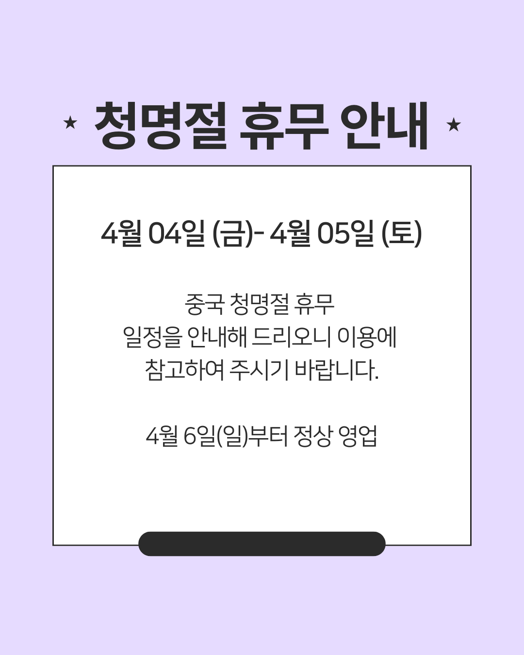 다가오는 중국 청명절을 맞이하여 아래와 같이 휴무 일정을 안내드리오니 이용에 참고하여 주시기 바랍니다.